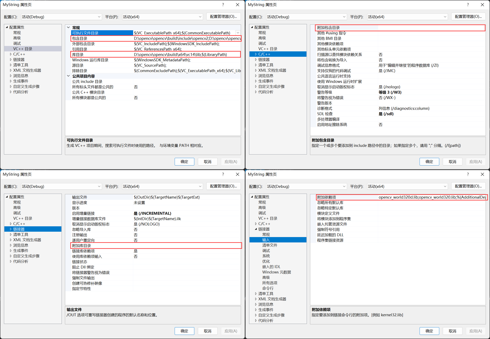 - 添加系统环境变量,VS中调试时可以通过 项目->属性->调试->环境 栏目添加.dll文件的path而成功调试,例如path=XXX/opencv/build/x64/vc14/bin/